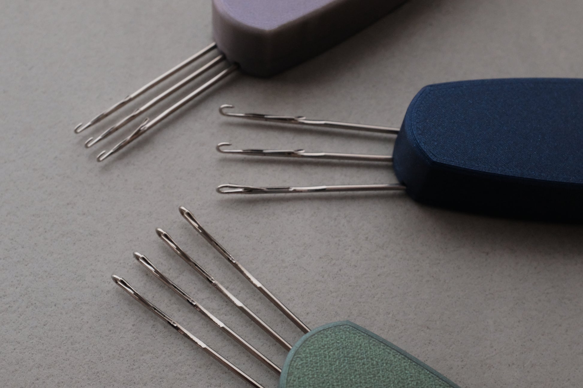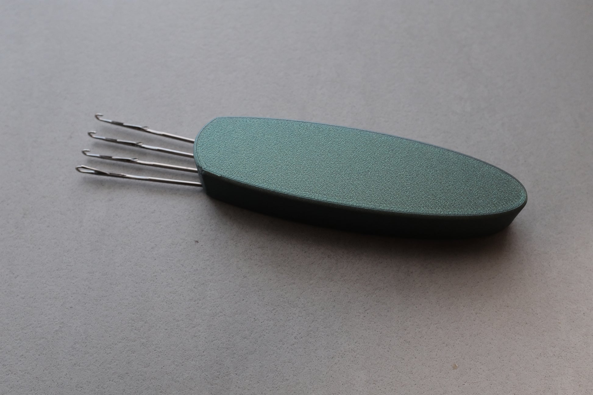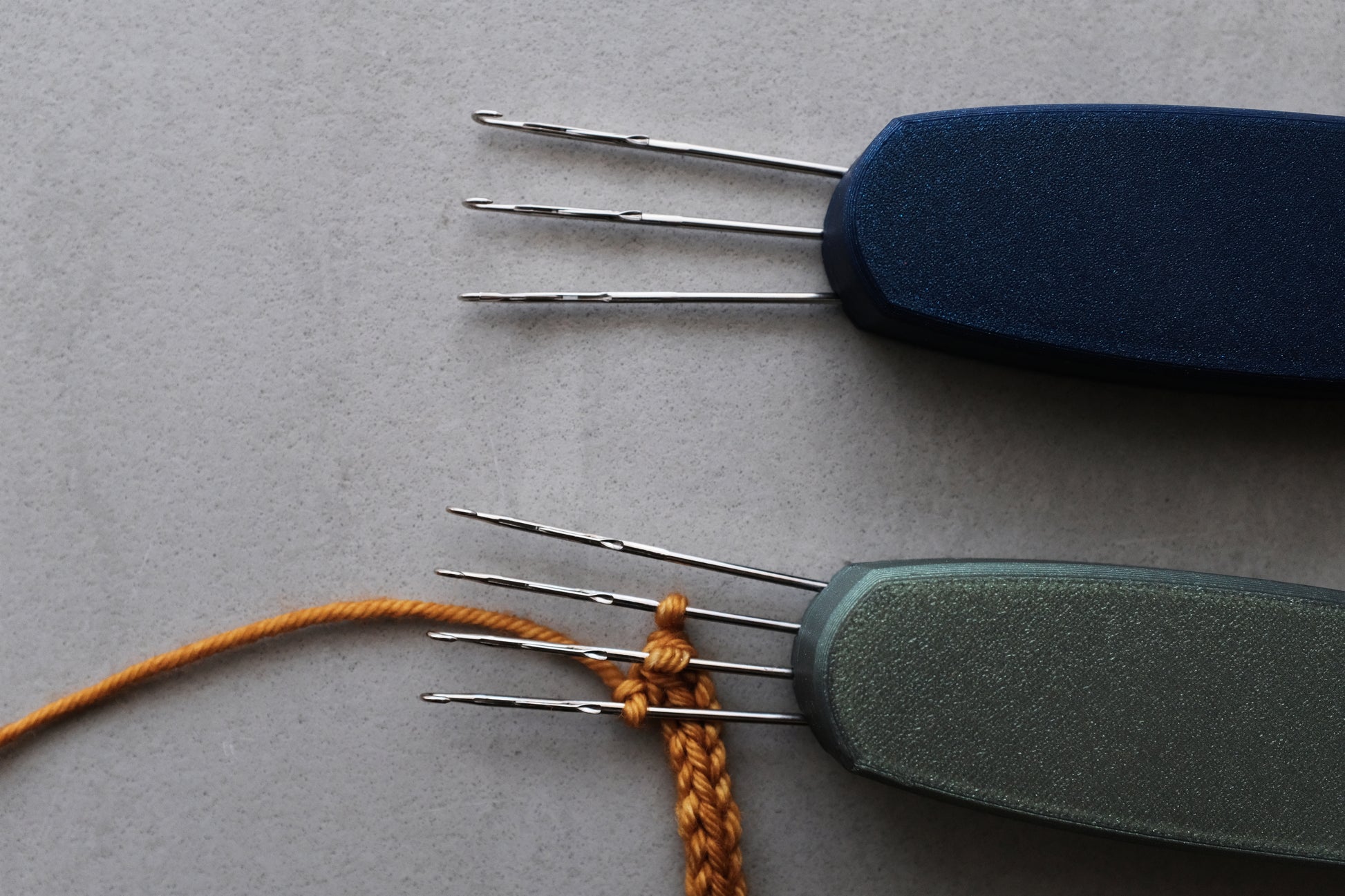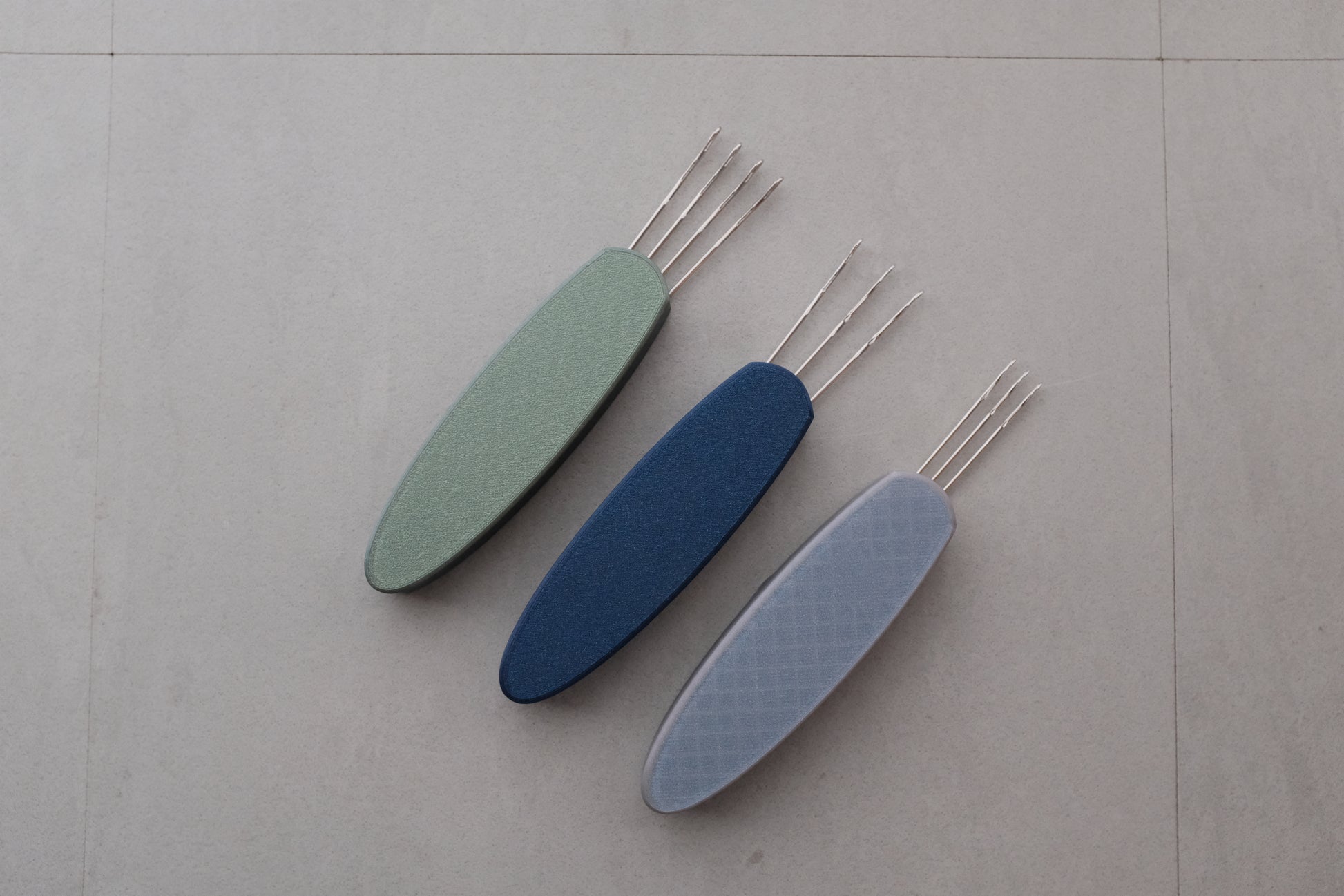持ち手は3Dプリントしたプラスチックで、ステンレス製の針が3本(または4本)ついています