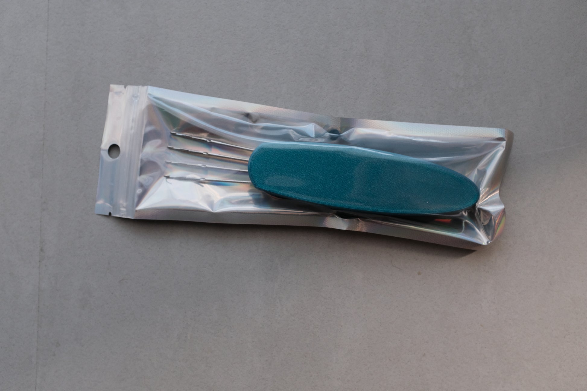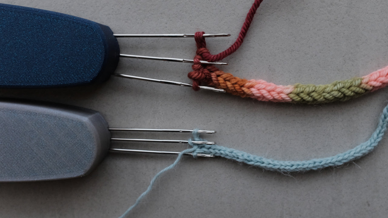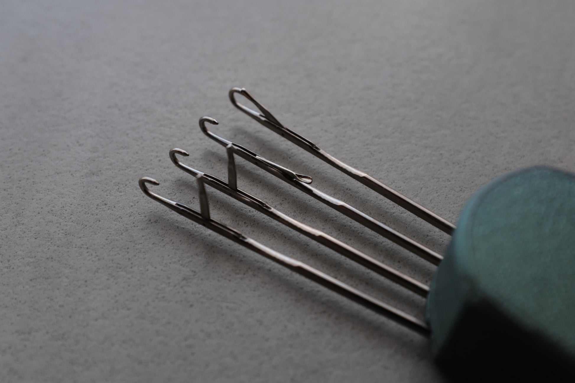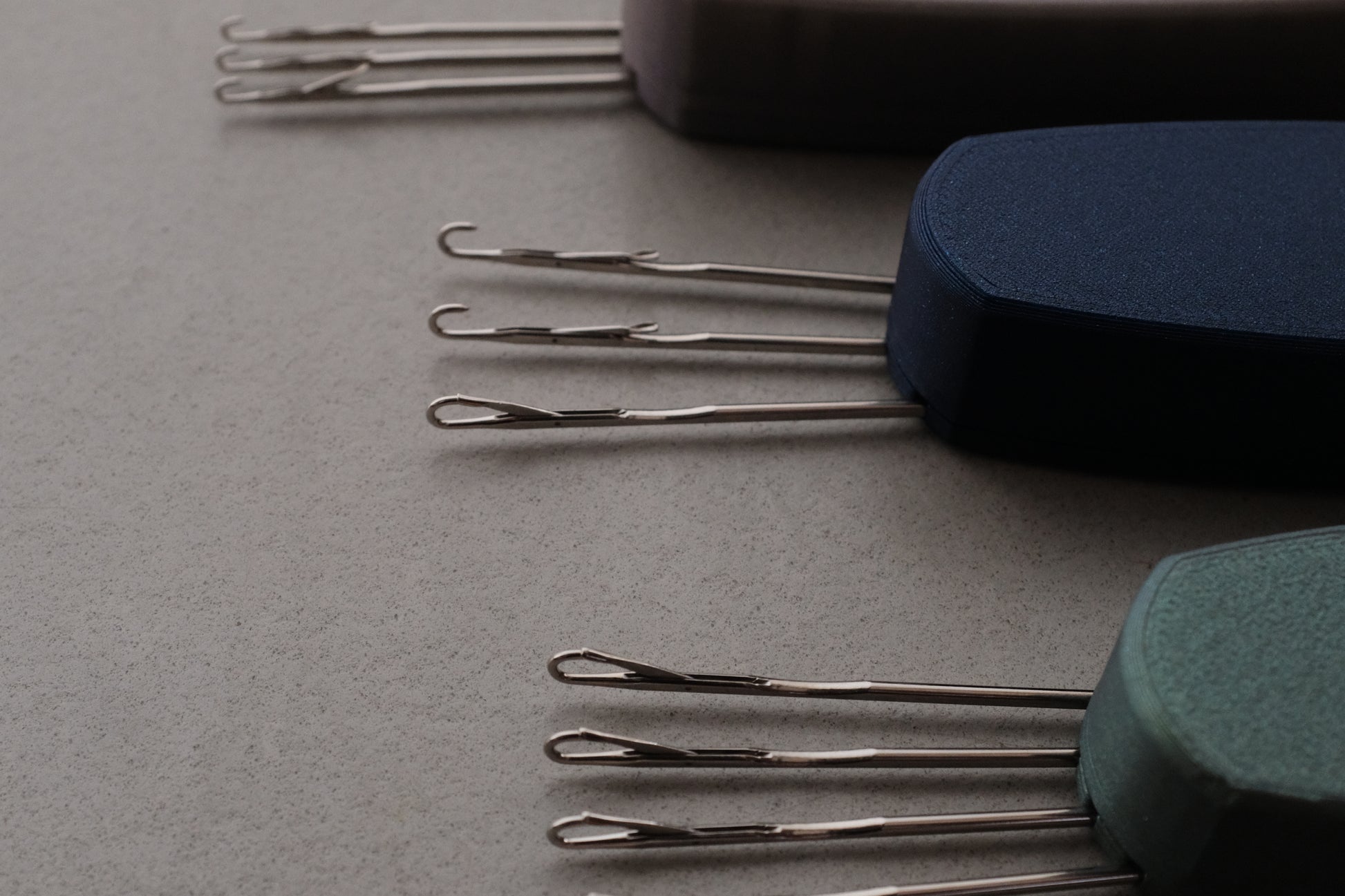 持ち手は3Dプリントしたプラスチックで、ステンレス製の針が3本(または4本)ついています