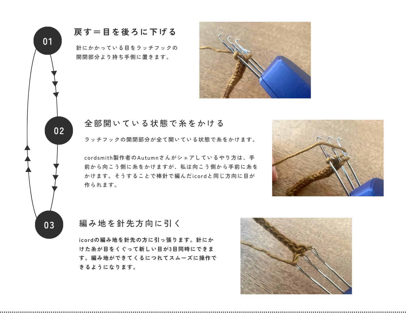 「cordsmith」のページ にも「cordsmithで2目のi-cordを編む+コツを掴めない時に参考になること」という動画を載せています。