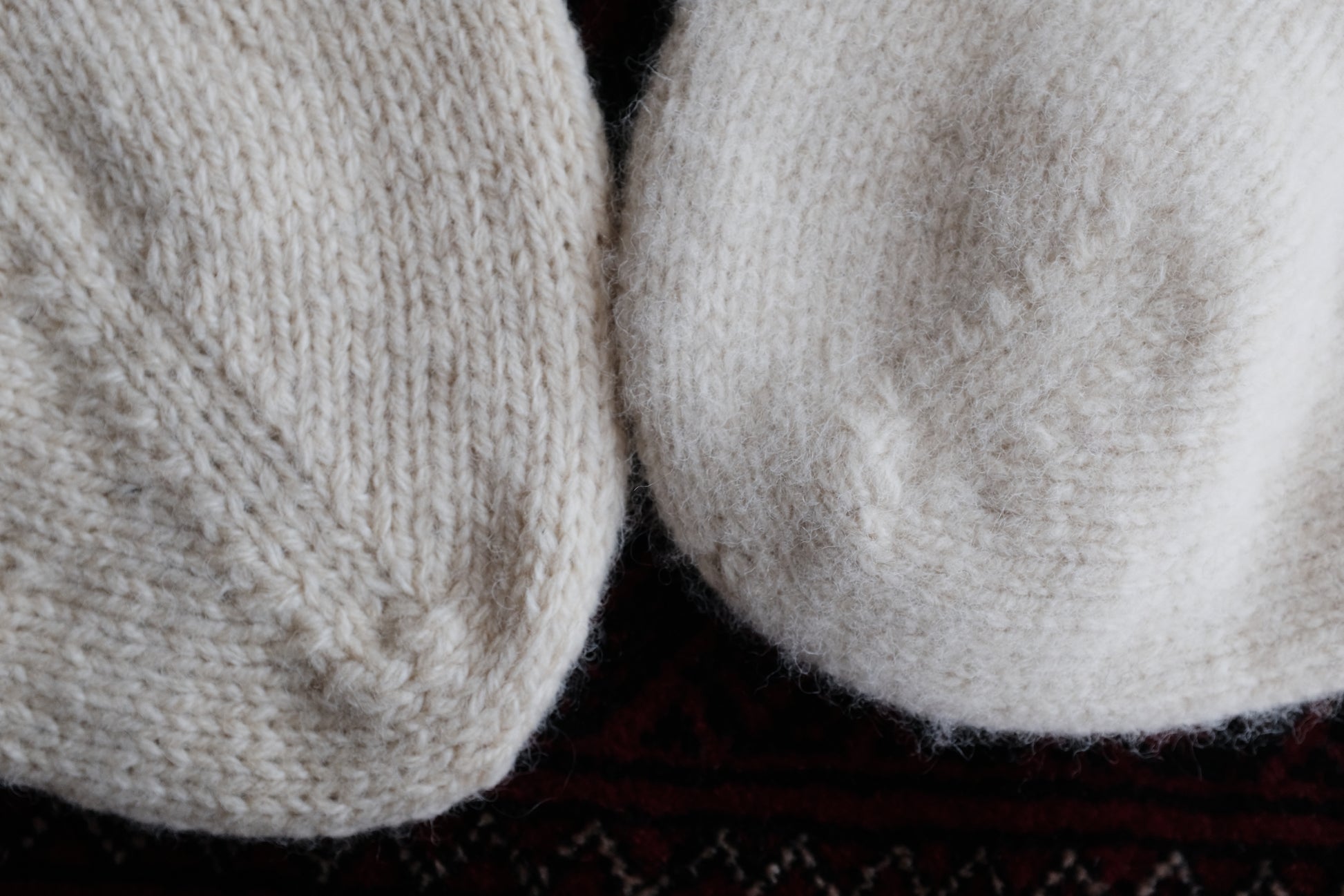 メリヤス編み 縮絨前 / 後 20目・29周 / 21目・32周