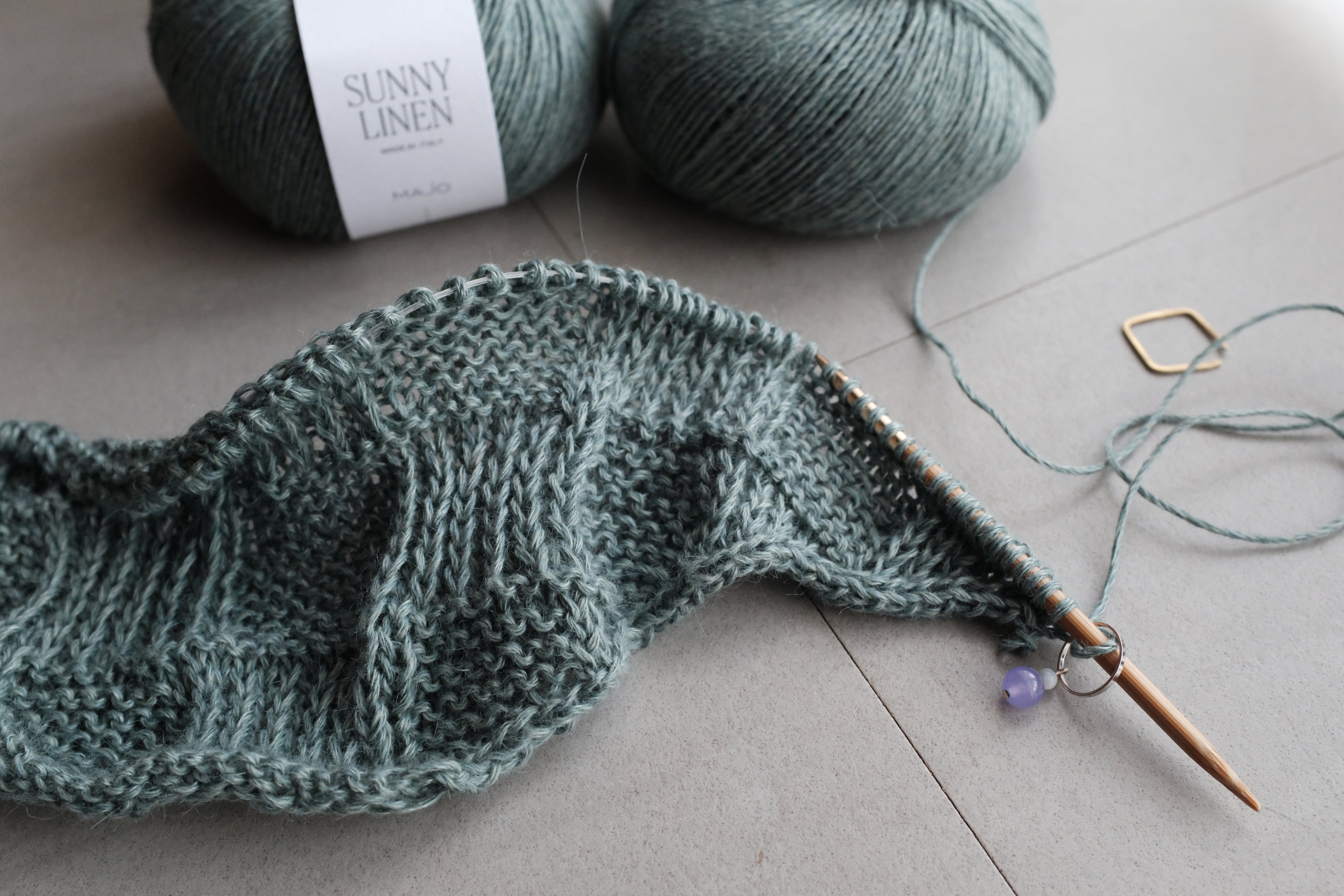 Yety Knits ゆかさんデザインの Acorde Cardi を編むために必要な糸 (MAJO GARN Sunny Linen) をお届けします。