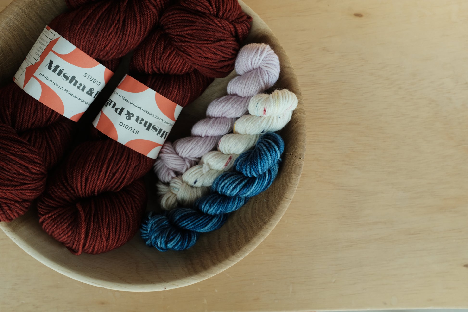 Studio Misha & Puffの、ちょっと懐かしい感じのする魅力的な色たちにインスピレーションをもらってデザインした Laurel Vest のための糸セットです。
