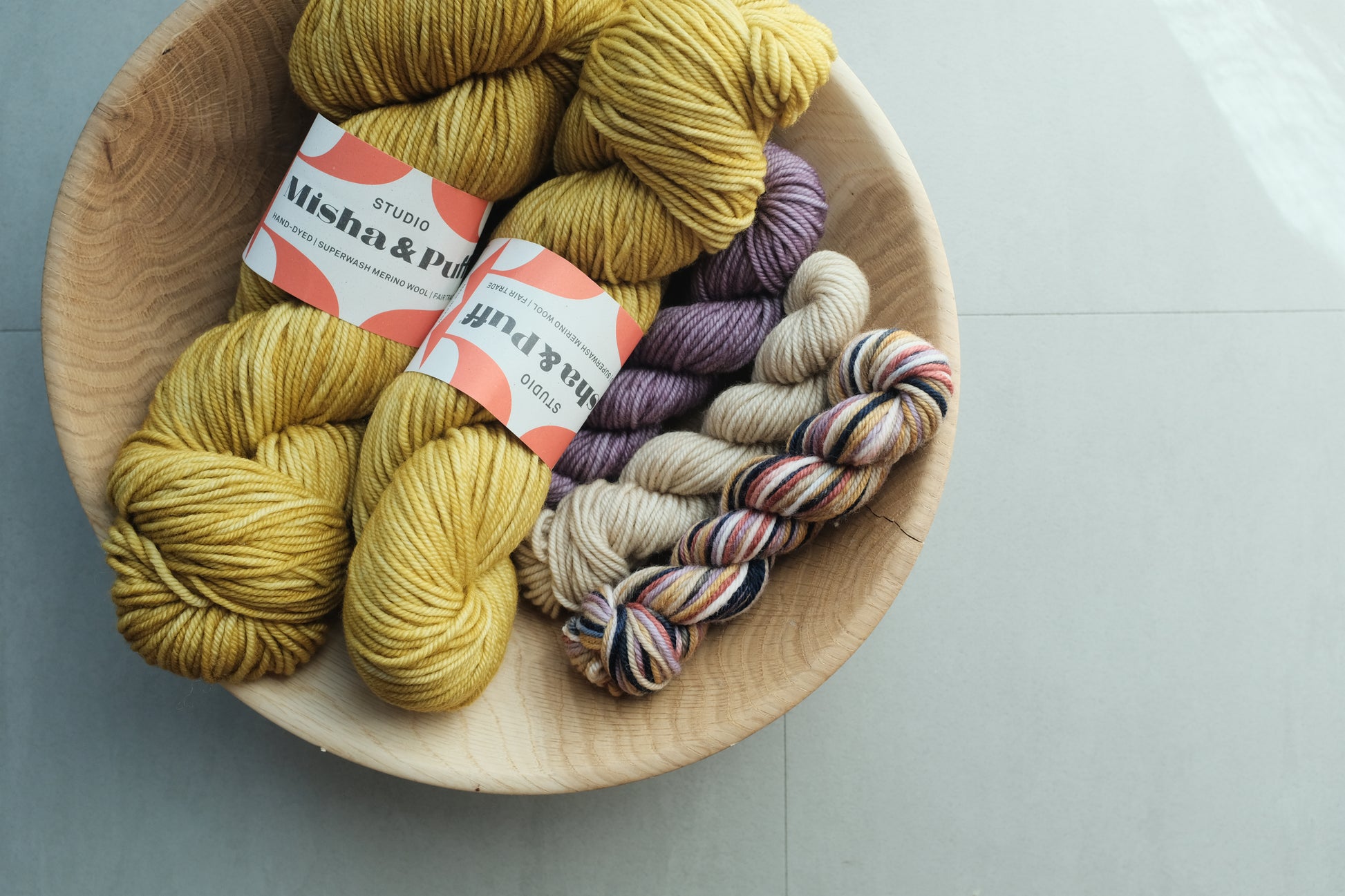 Studio Misha & Puffの、ちょっと懐かしい感じのする魅力的な色たちにインスピレーションをもらってデザインした Laurel Vest のための糸セットです。