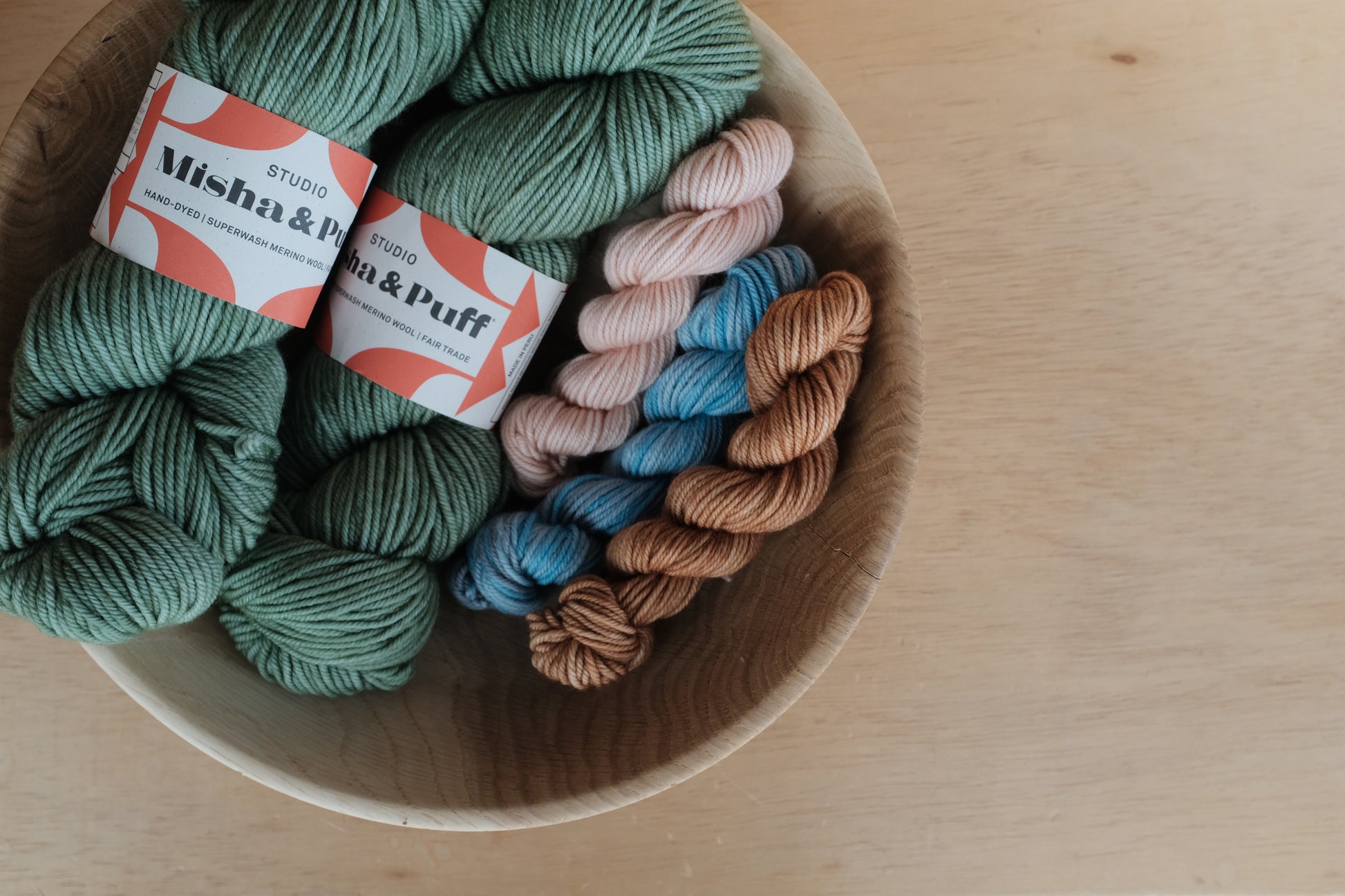 Studio Misha & Puffの、ちょっと懐かしい感じのする魅力的な色たちにインスピレーションをもらってデザインした Laurel Vest のための糸セットです。