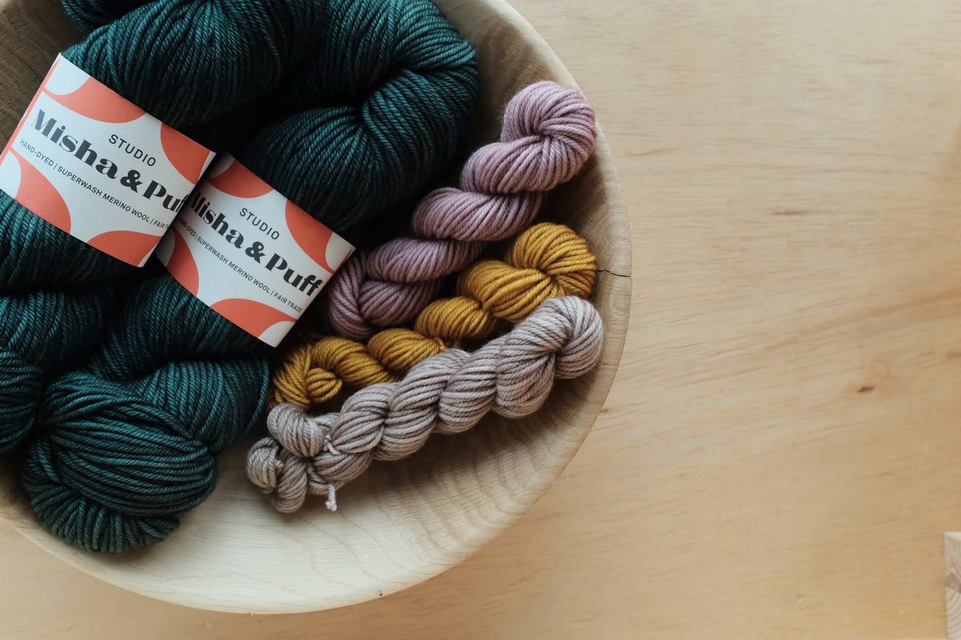 Studio Misha & Puffの、ちょっと懐かしい感じのする魅力的な色たちにインスピレーションをもらってデザインした Laurel Vest のための糸セットです。