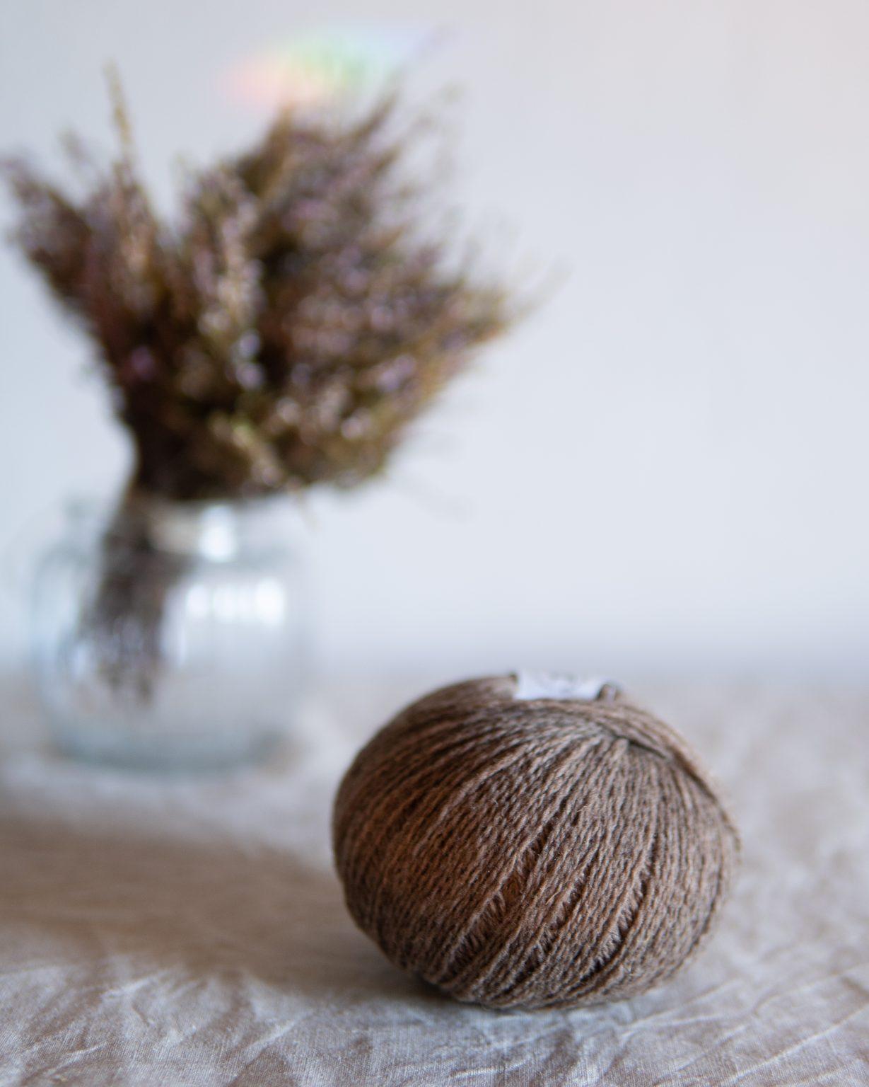 羊毛を糸にするまでの工程で必要最小限の加工のみをしており、糸の中に植物などの混入物が見られますが、ほとんどは簡単に取り除けます。カサっとしたドライな風合いの糸ですが、水通しで柔らかくなりふっくらとします。
