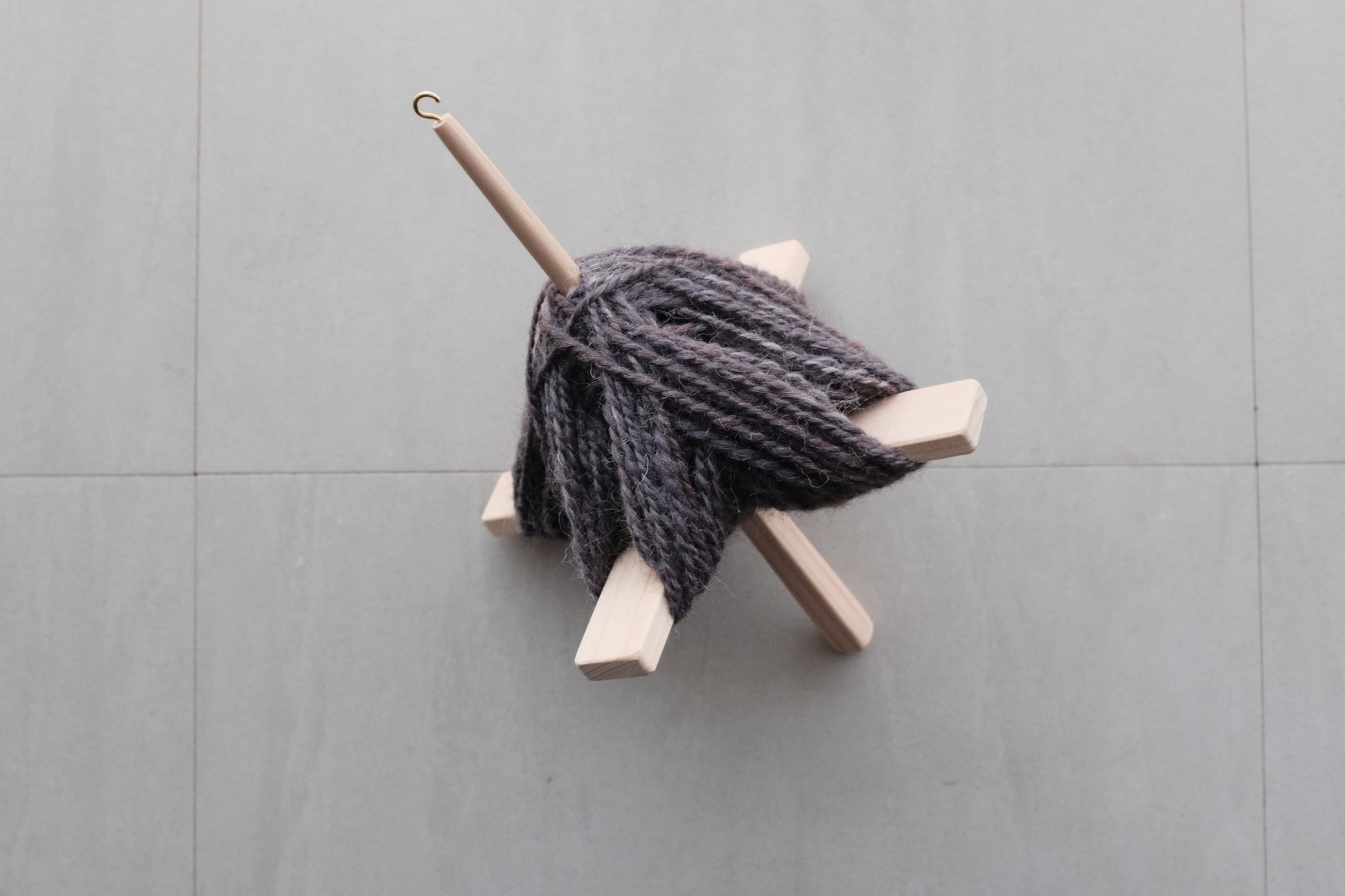 クロスした羽根のような部分に紡いだ糸を巻き取っていけるので、紡ぎ始めと紡ぎ終わりの双方から糸が引き出せる形状の糸玉を作りながら紡いでいくことができます。